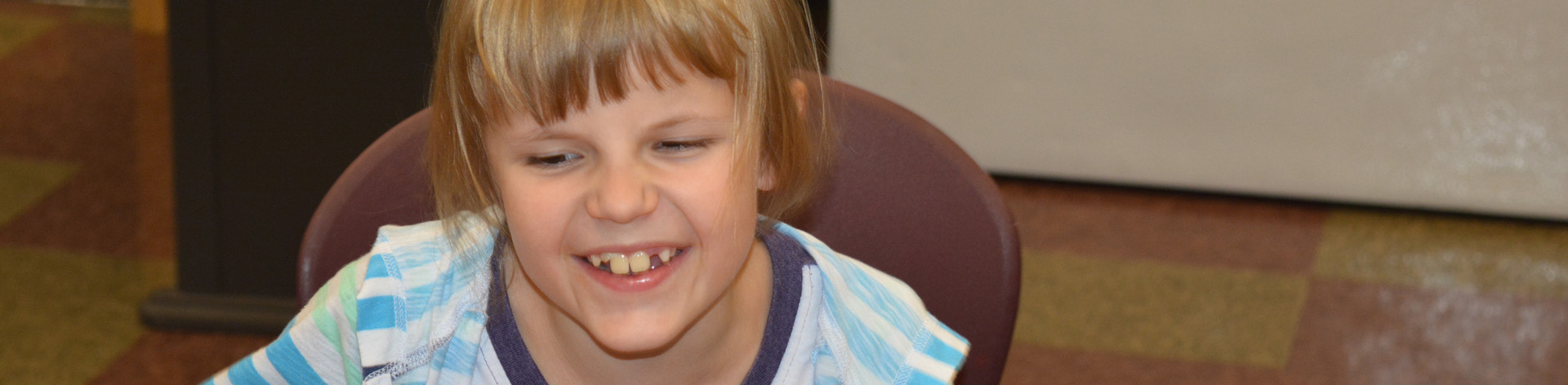 A blind boy reaches forward to check his spelling while working on a Braille writer under learning shades.